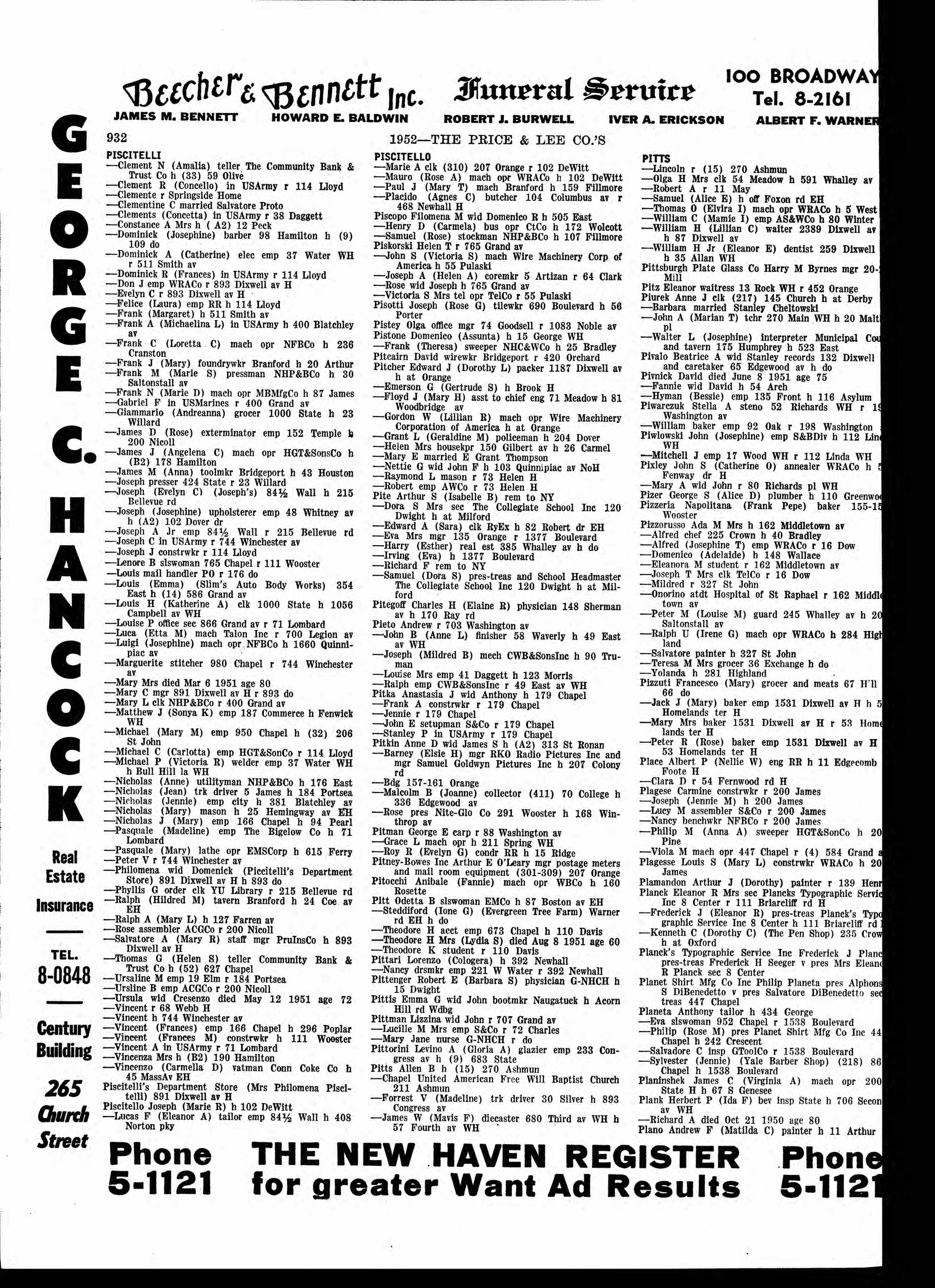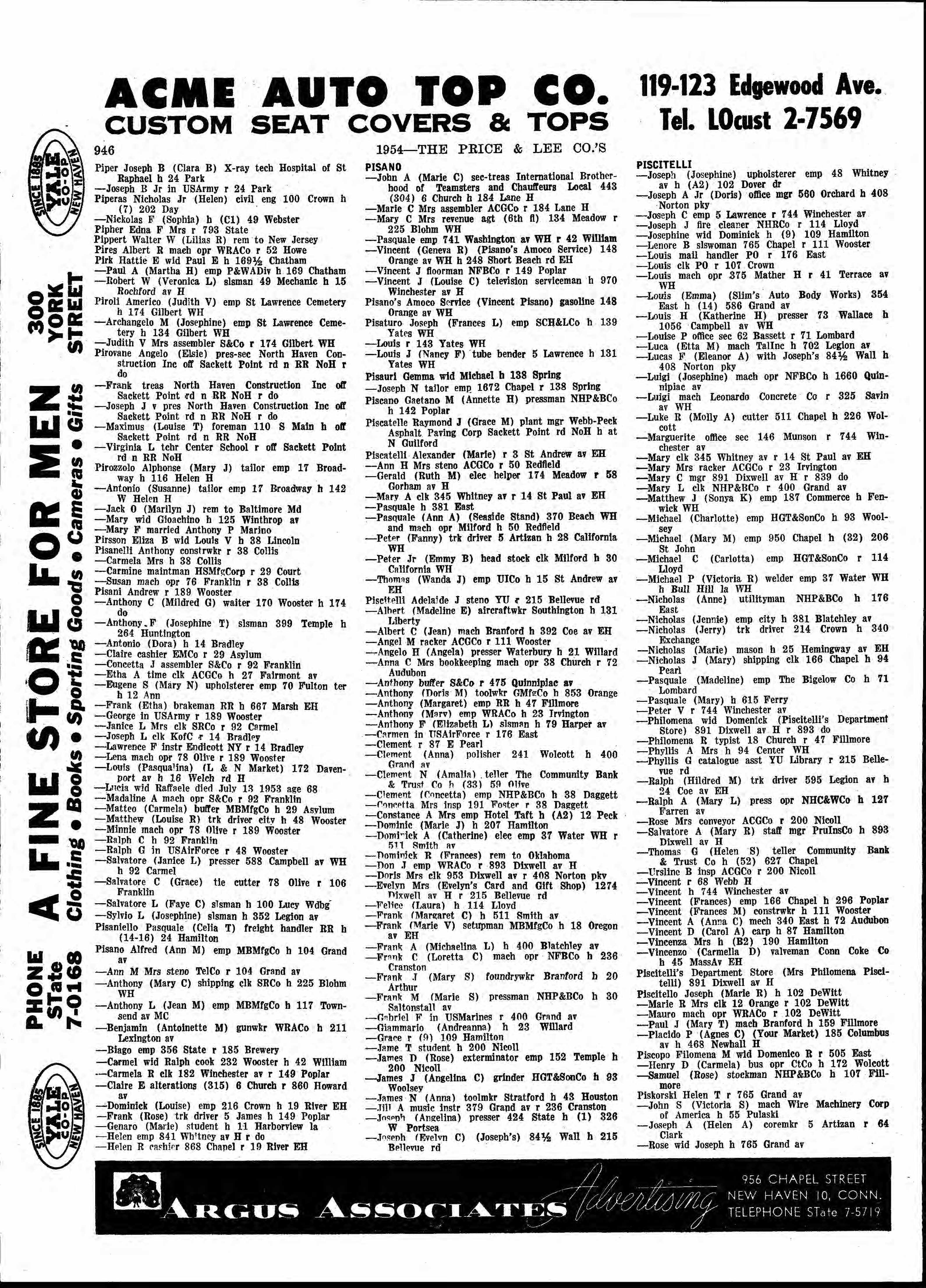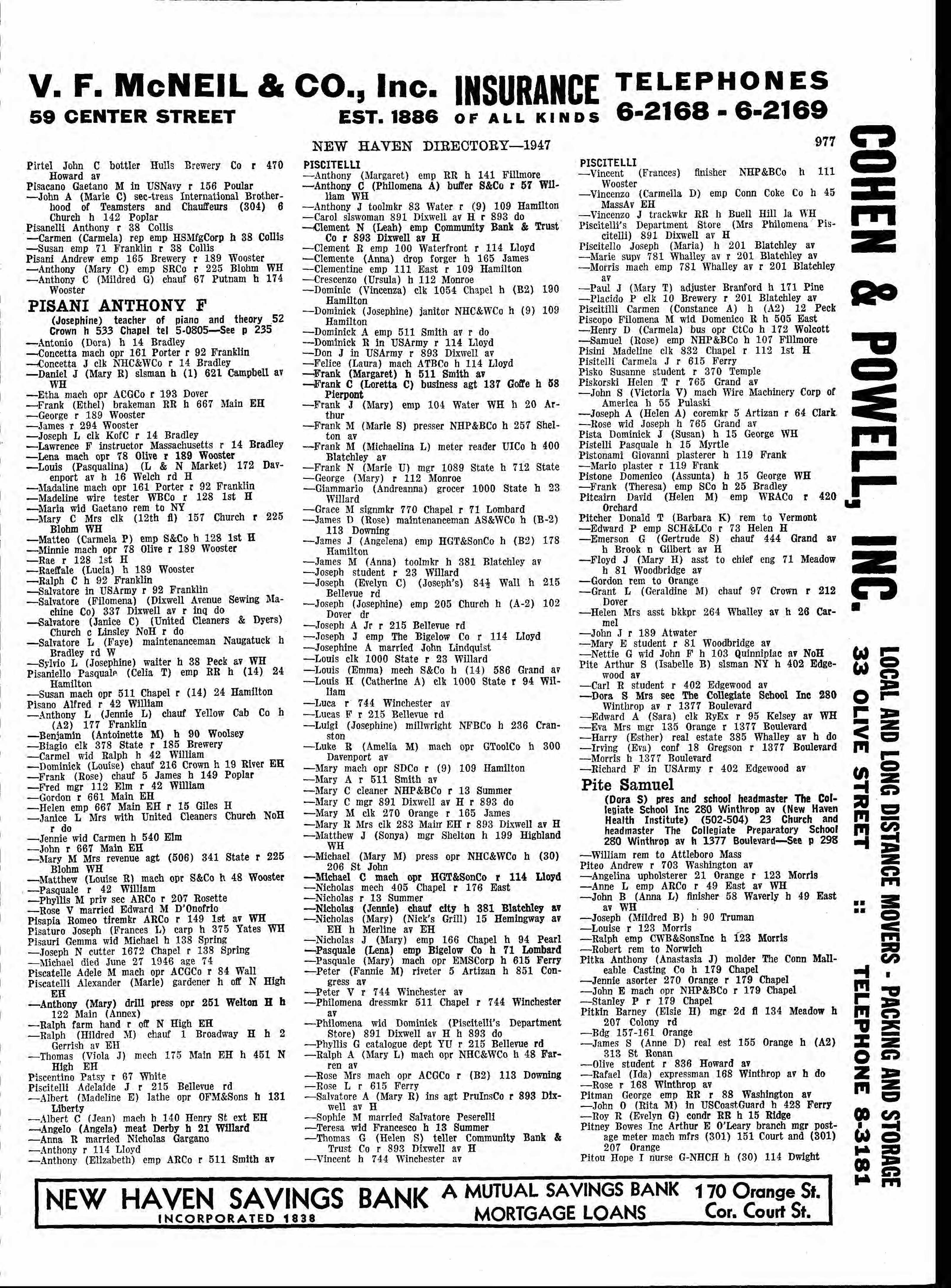 Name: Vincenzo J Piscitelli Gender: Male Residence Year: 1939 Street address: Bull Hill la WH Residence Place: New Haven, Connecticut, USA Occupation: Trackwkr Spouse: Rose Piscitelli Publication Title: New Haven, Connecticut, City Directory, 1939