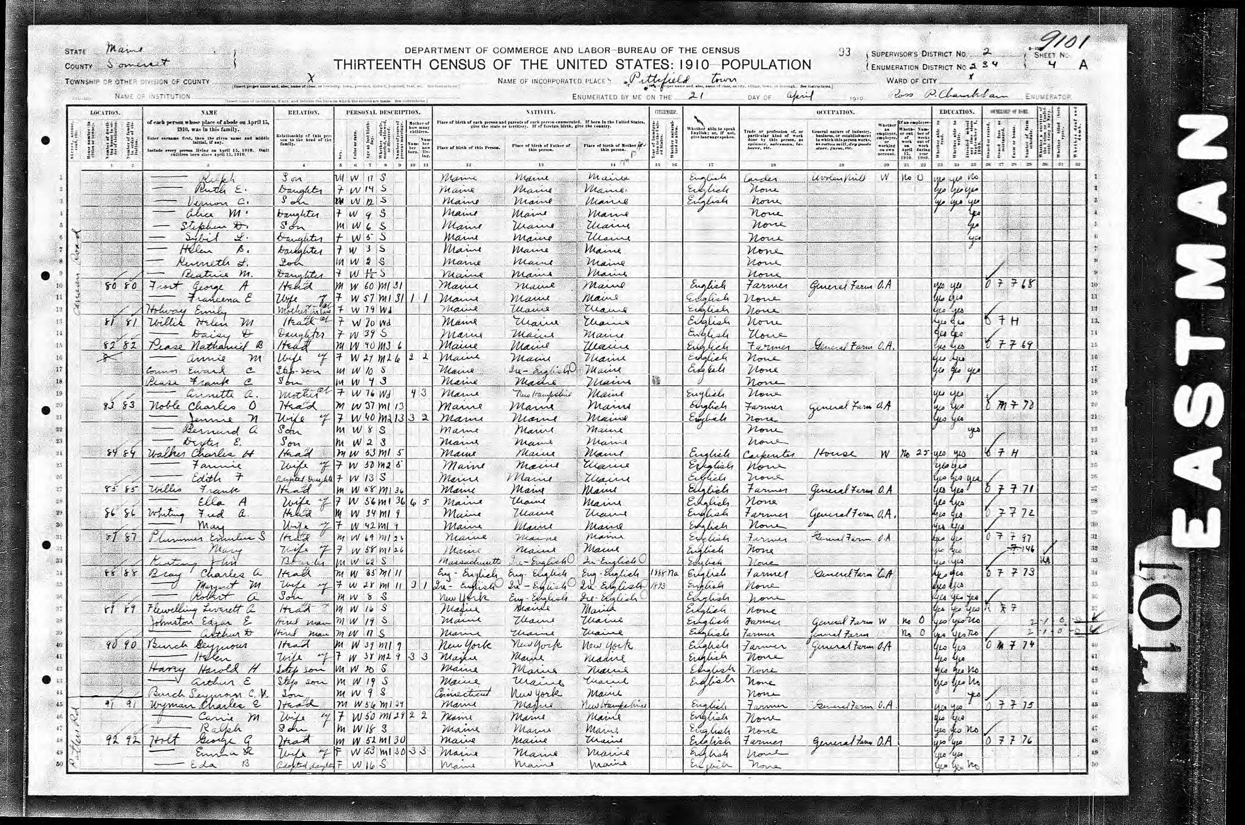 Nathaniel B Pease Jr 1910 Census |