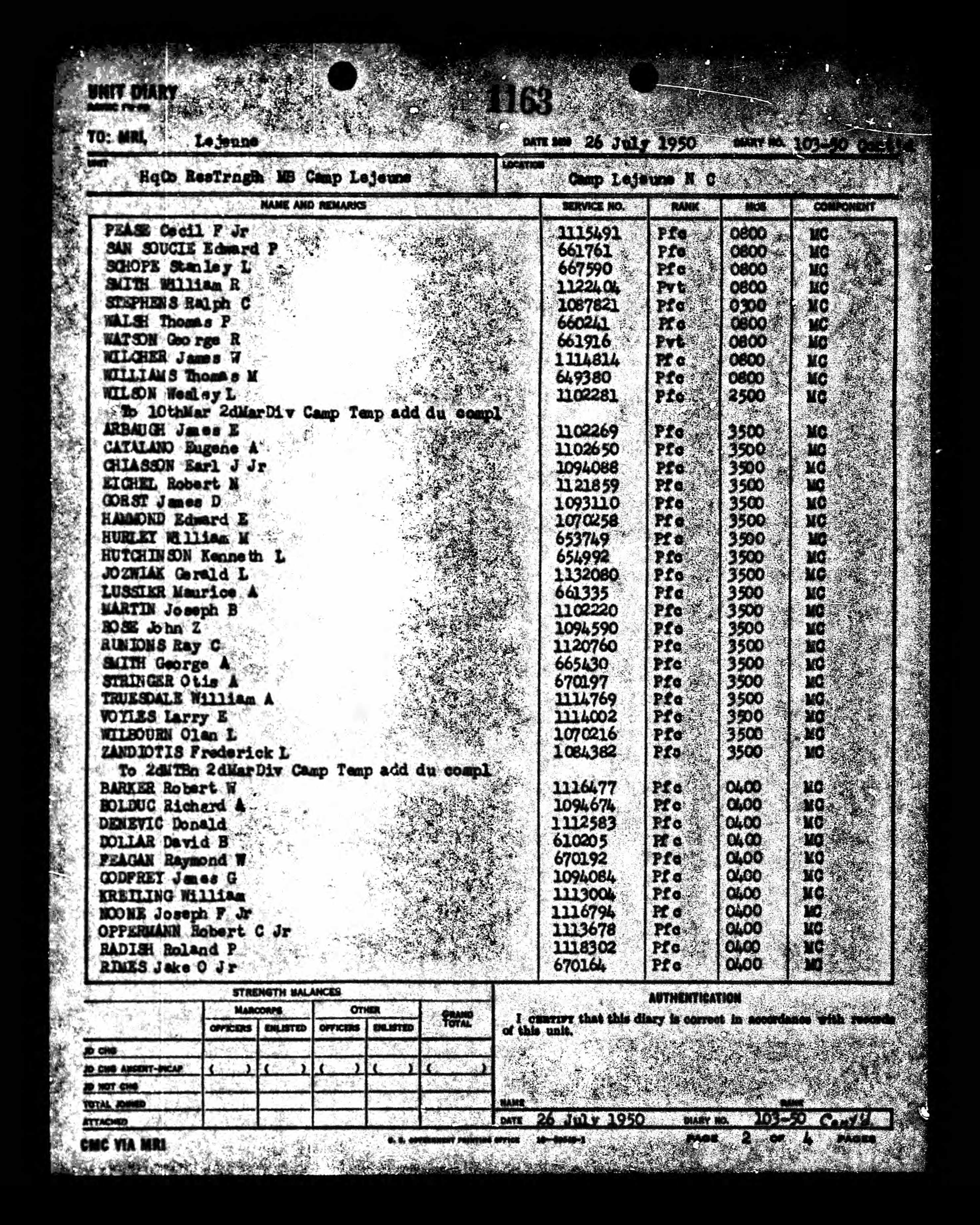 Cecil Frank Pease Jr 1950 USMC Muster |